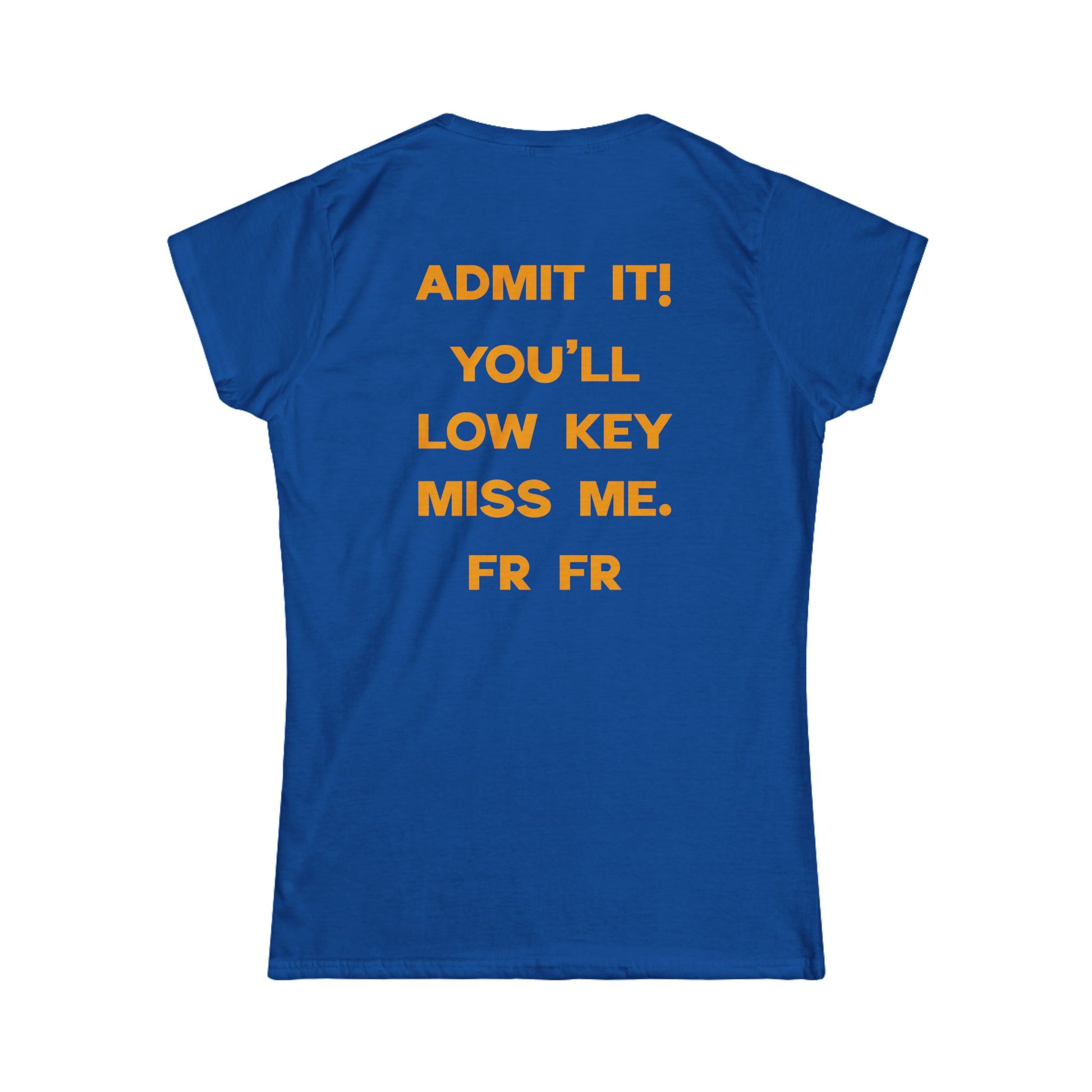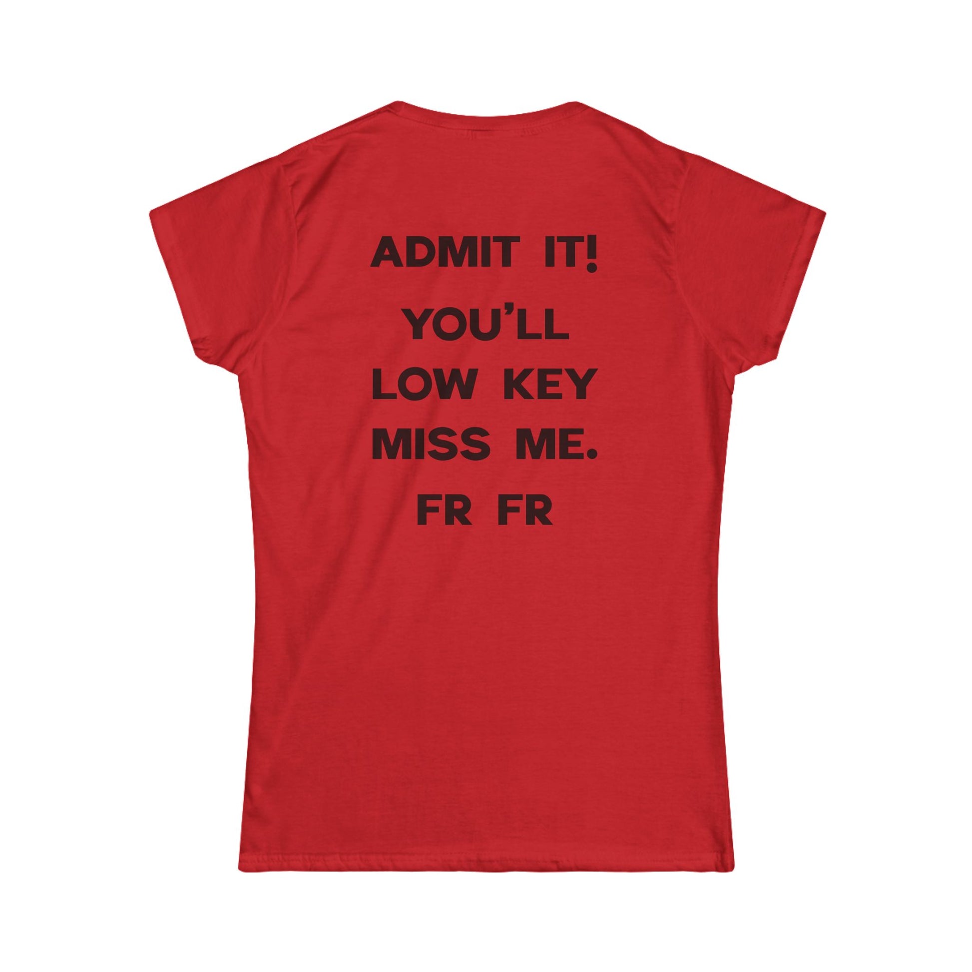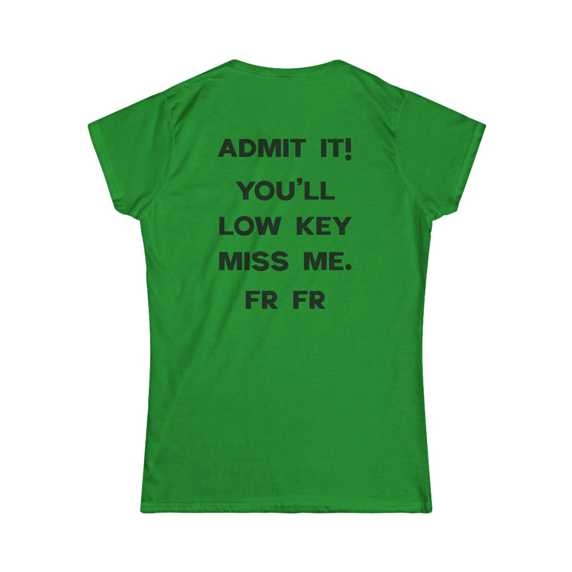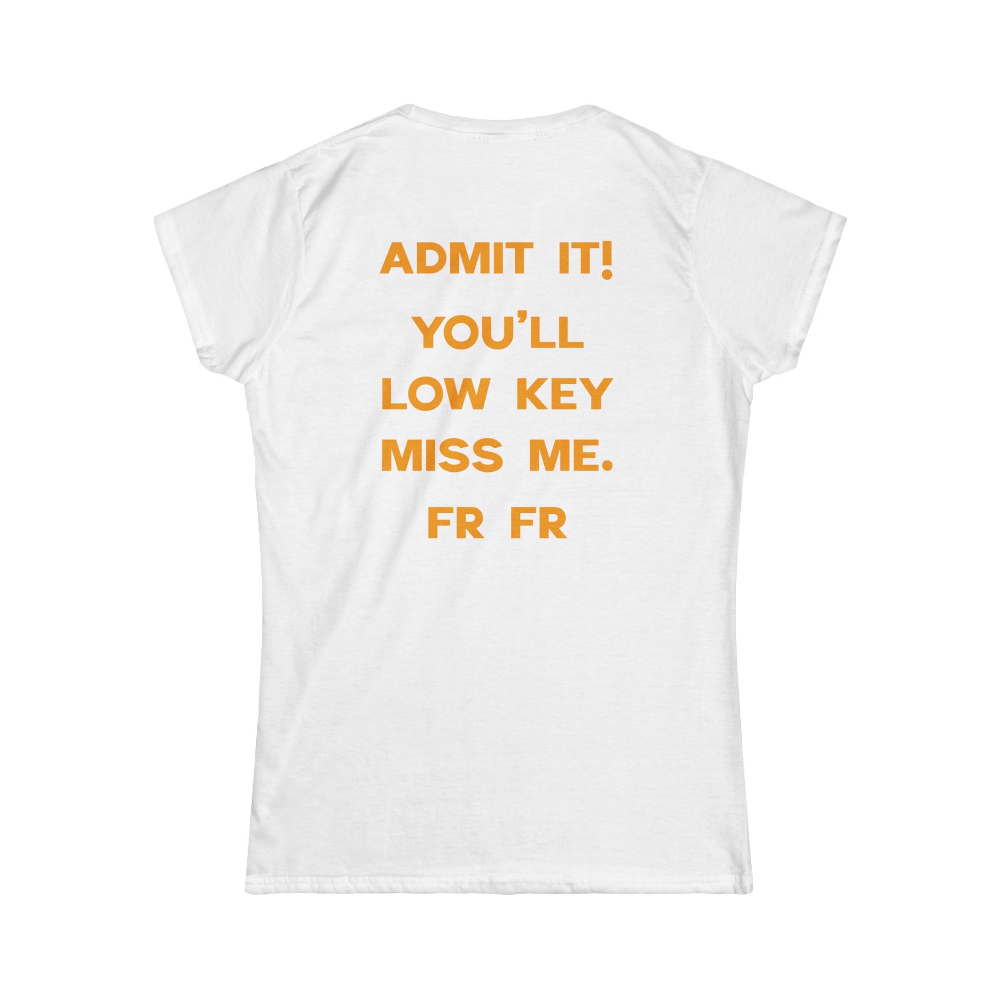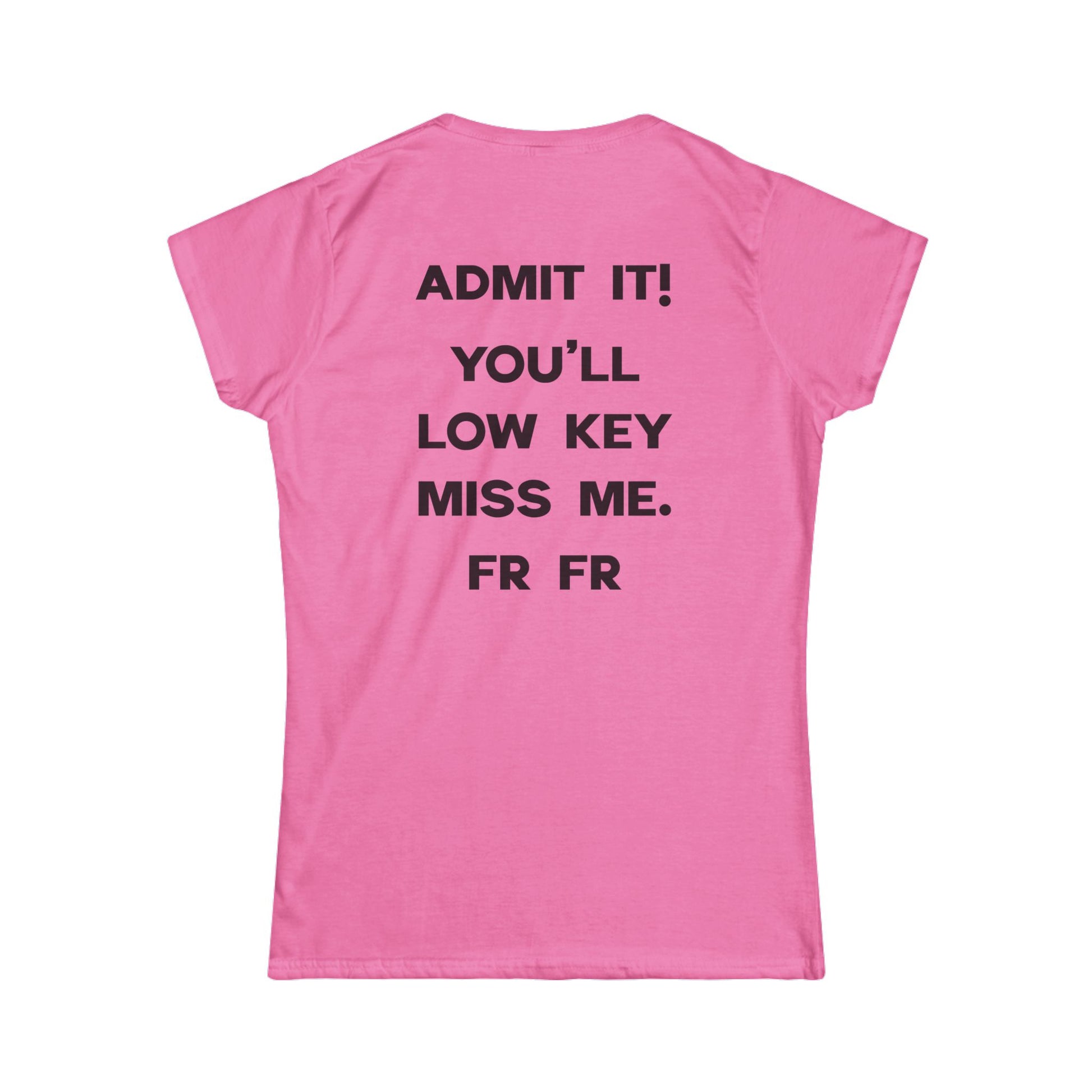 Back of T-shirt says "ADMIT IT! YOU'LL LOW KEY MISS ME. FR FR"